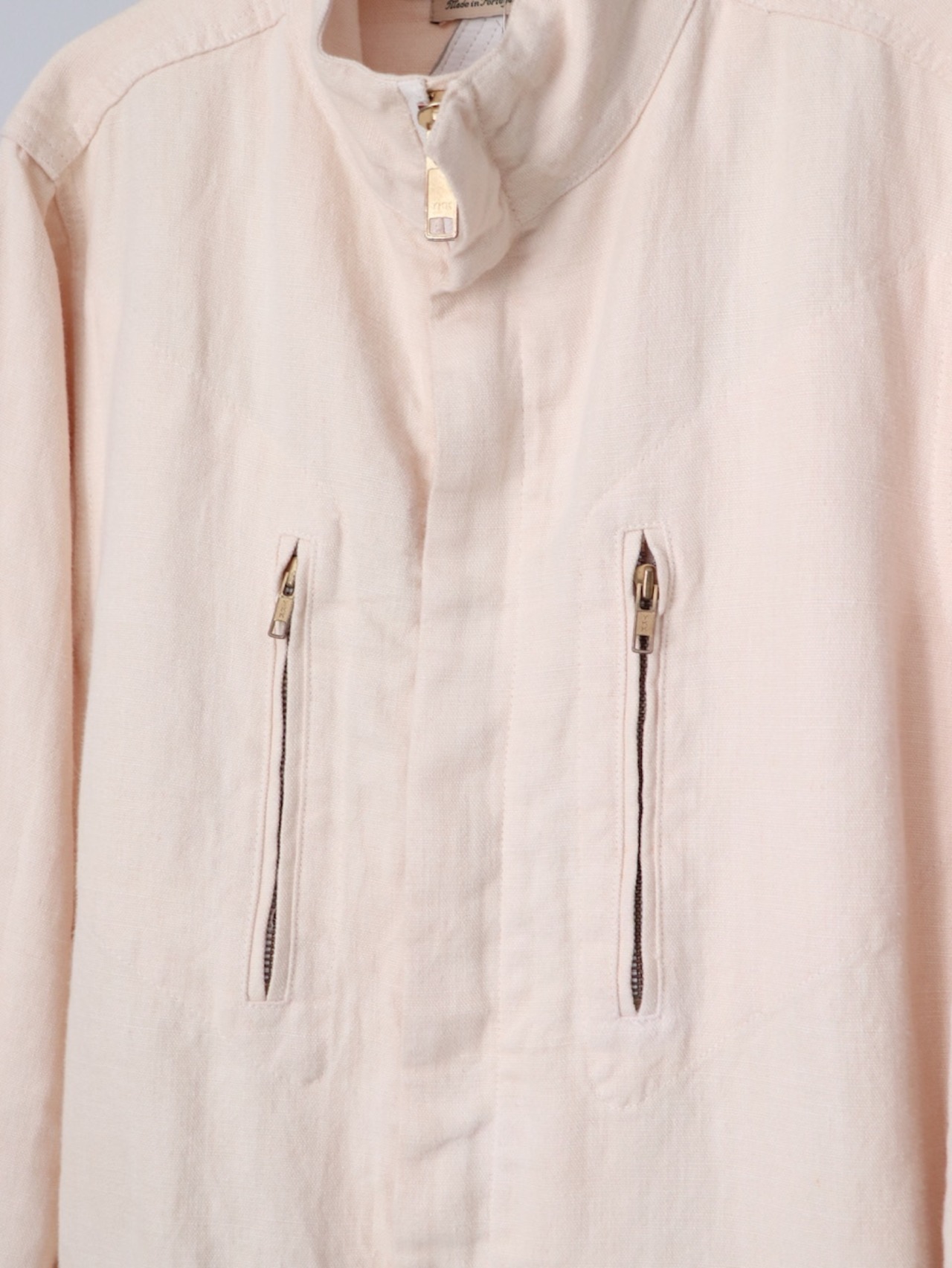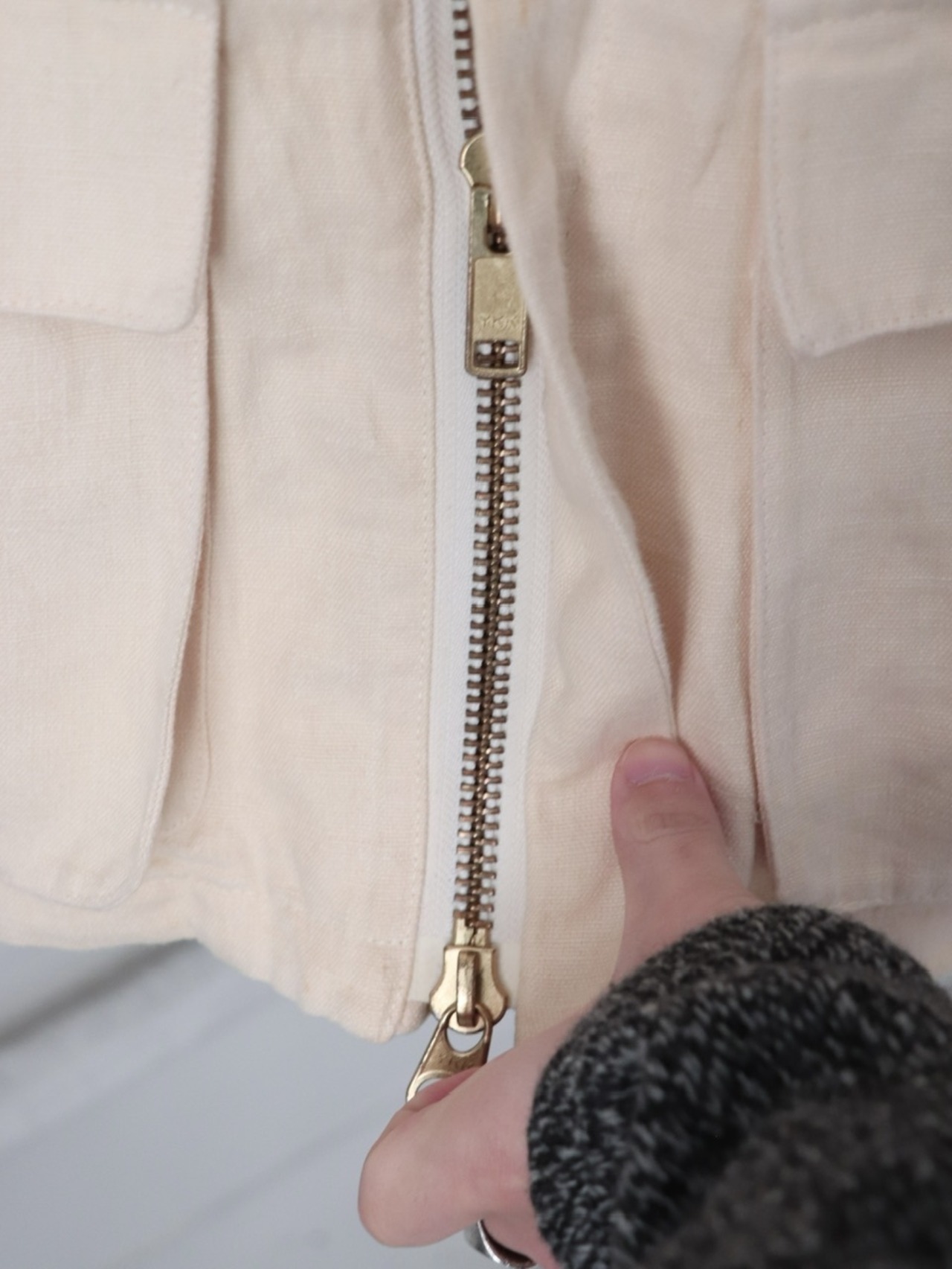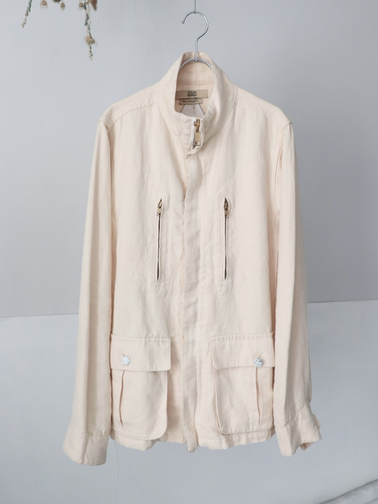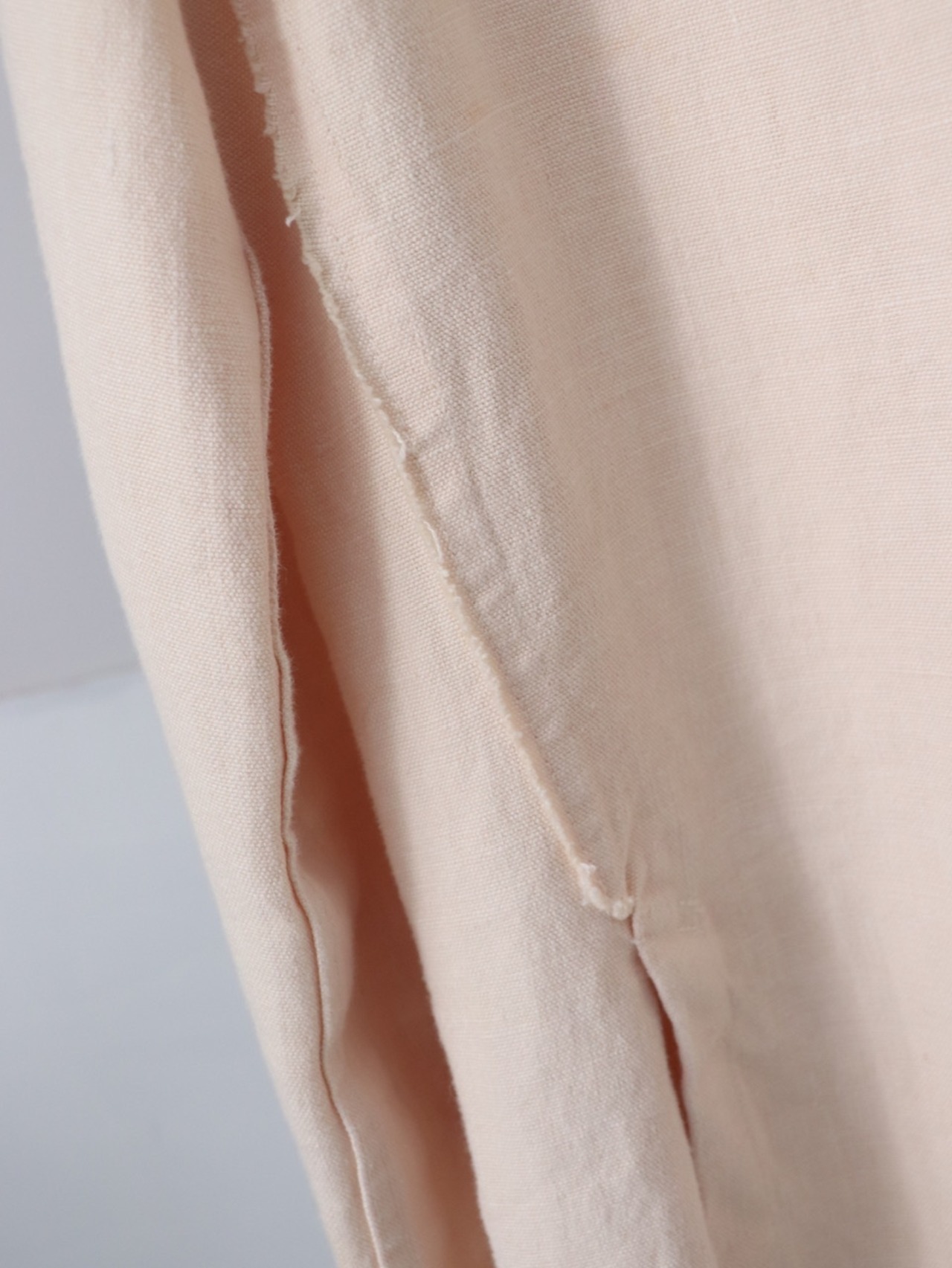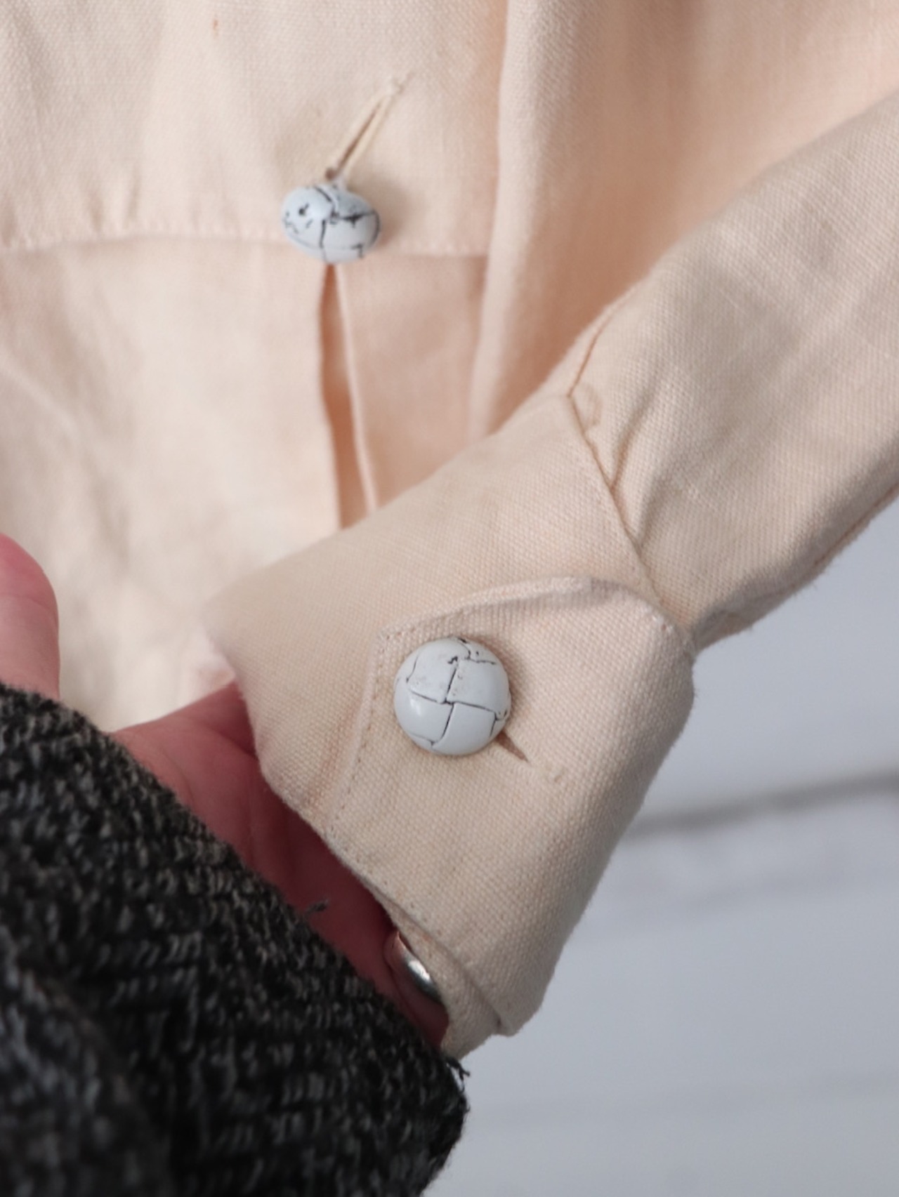肉厚の生成りのリネン、随所の断ち切り、胡桃ボタンなど、クラフトワークを感じれるアルチザンな1着。