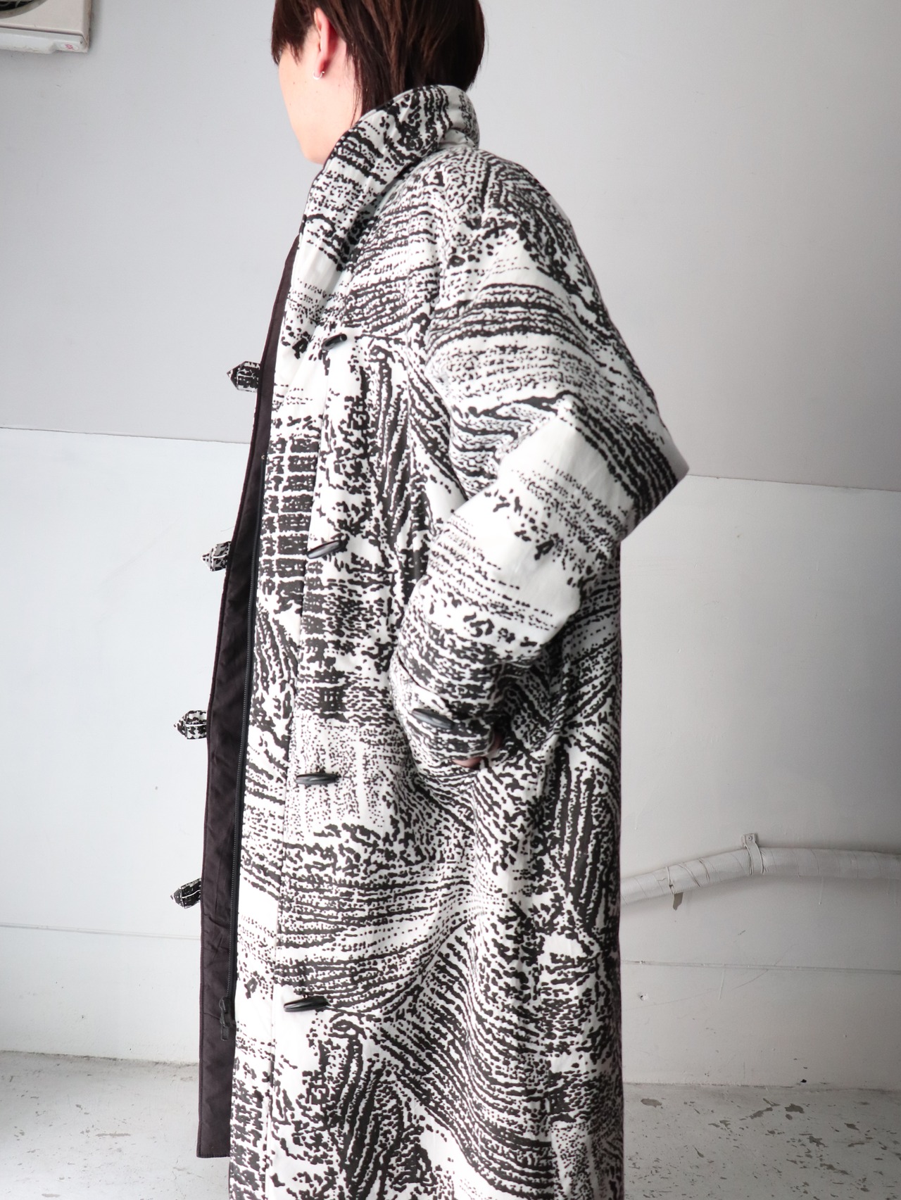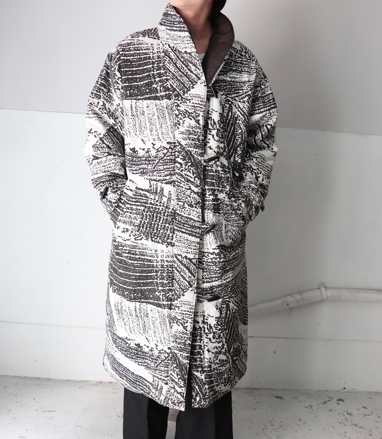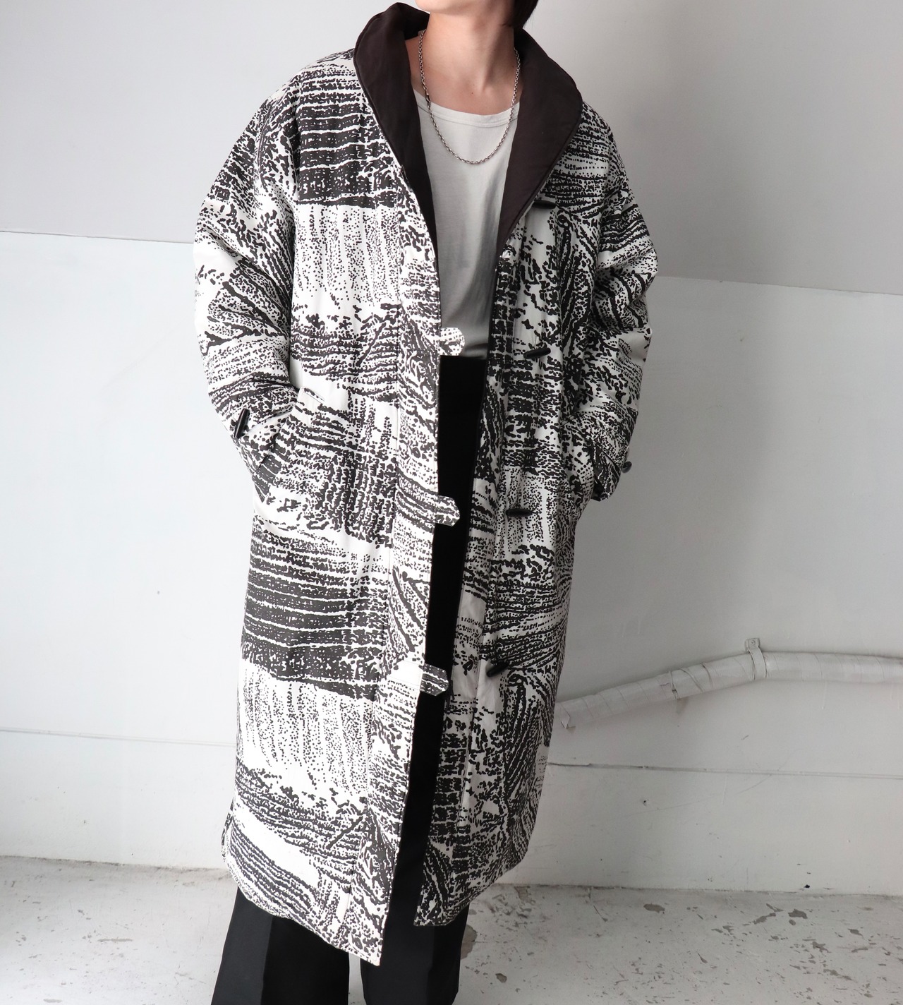 飛ばし絵の様な印象的プリントデザインが効いたラグジュアリーな1枚。
