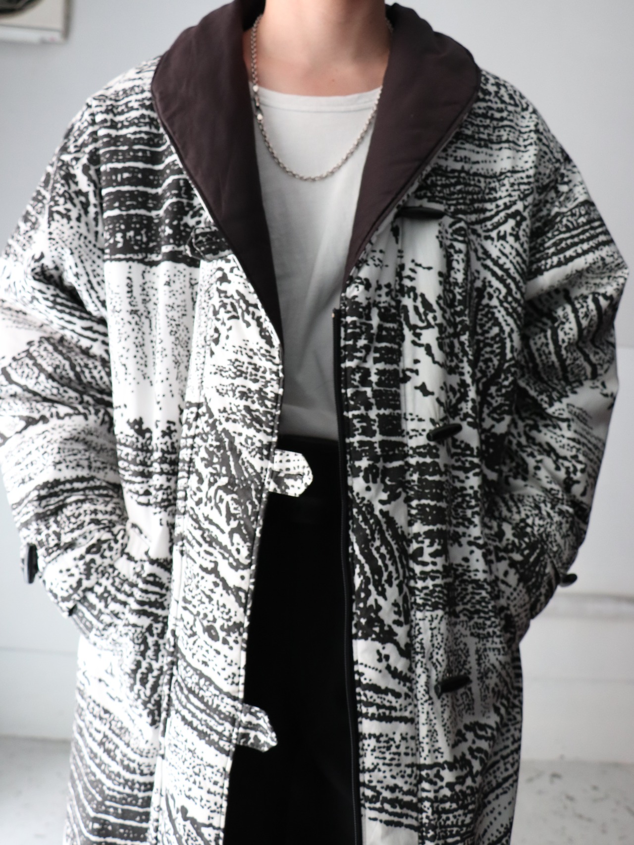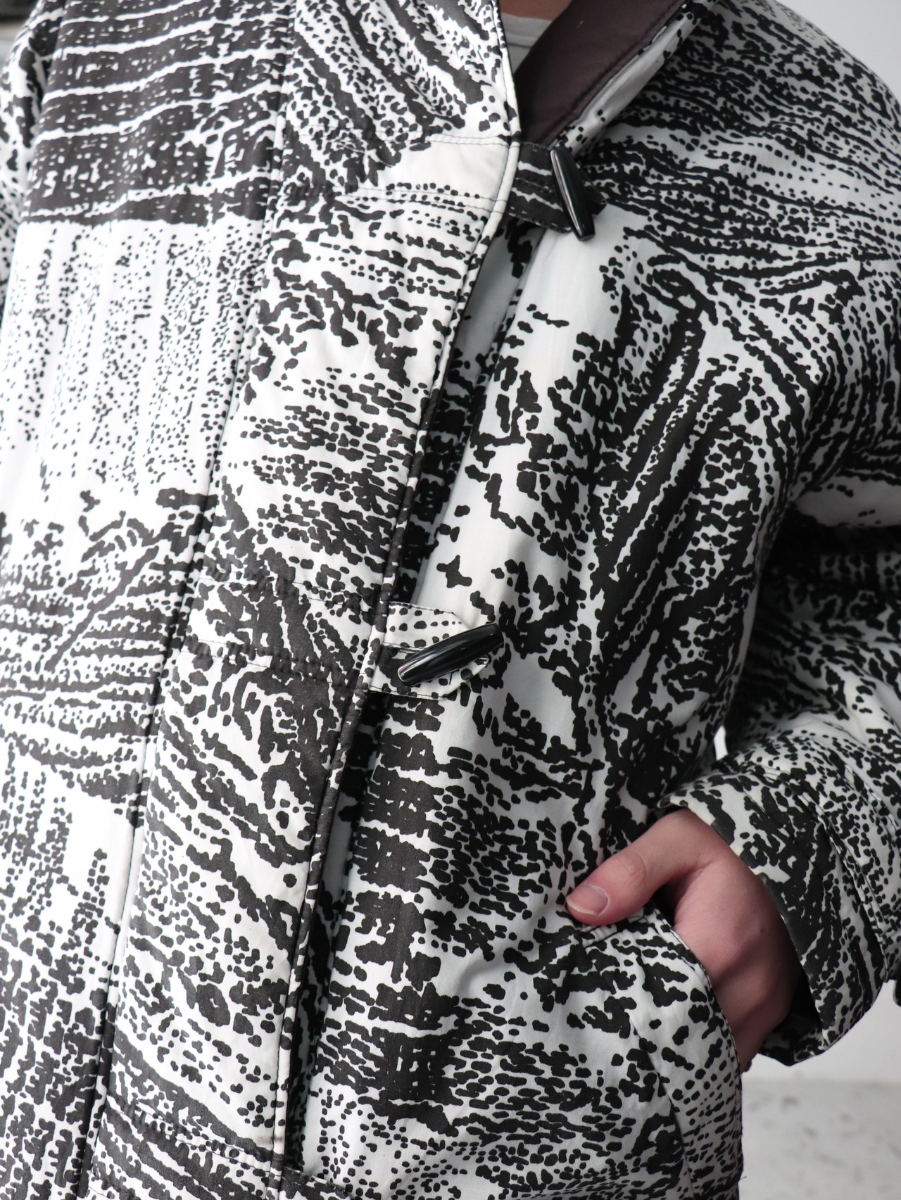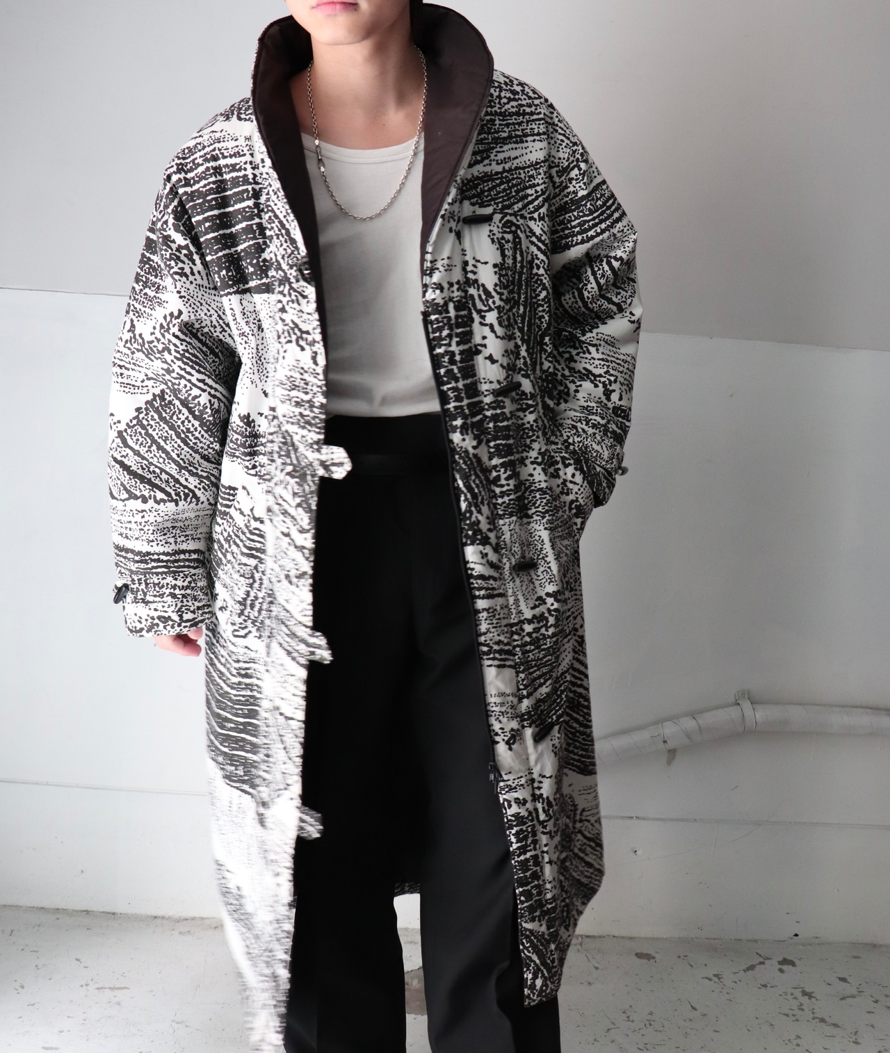 飛ばし絵の様な印象的プリントデザインが効いたラグジュアリーな1枚。