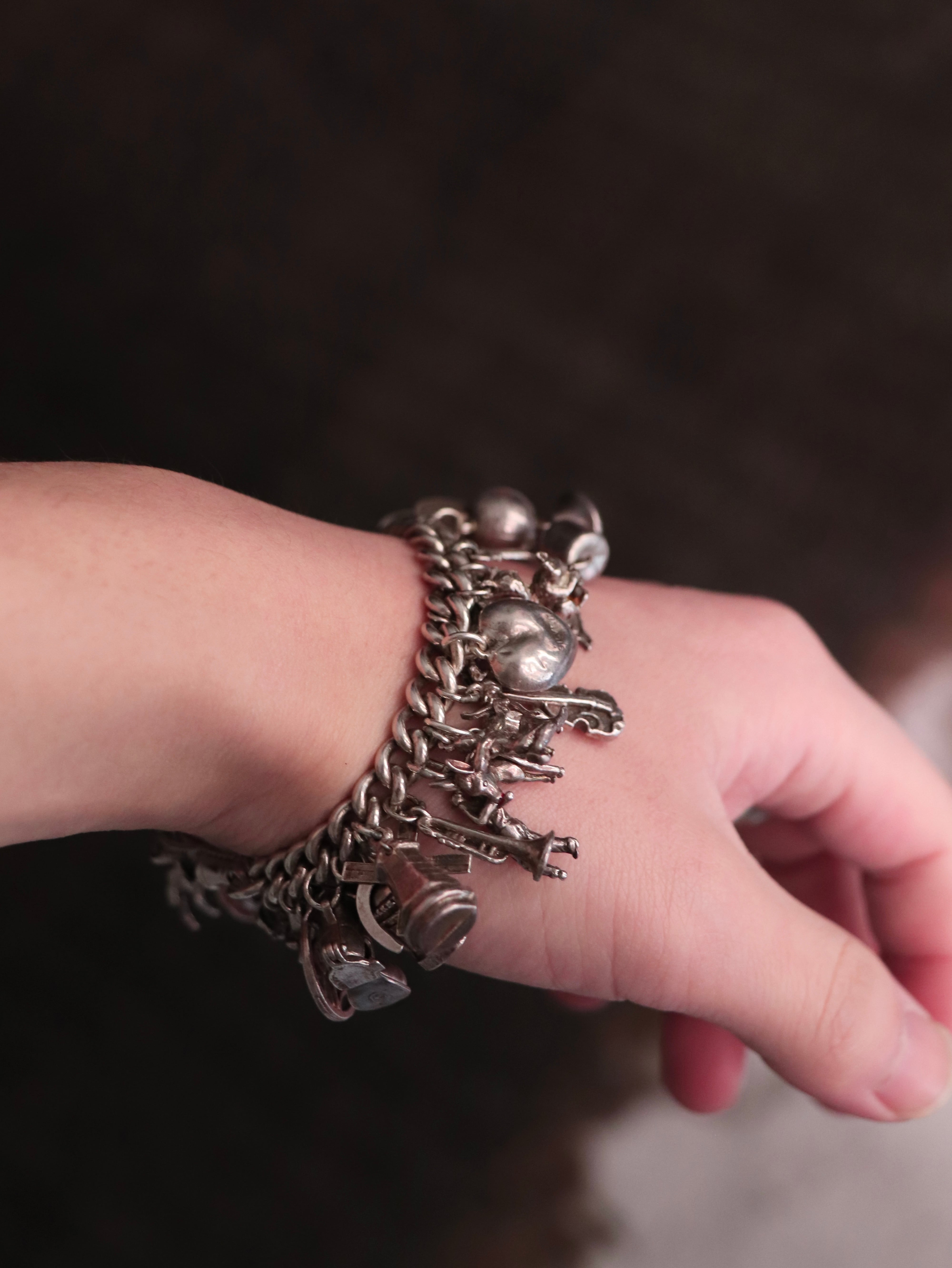 これでもかというくらいチャームのついたシルバーブレスレット。
