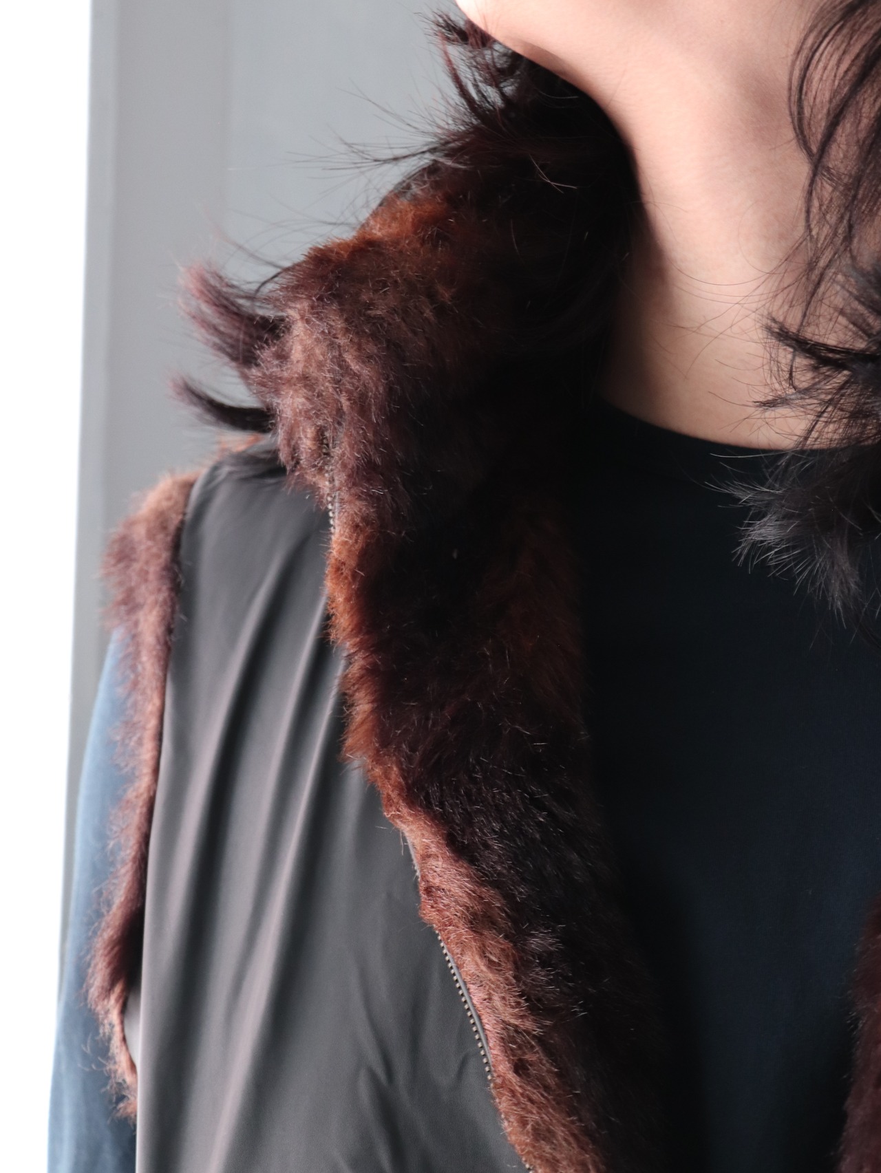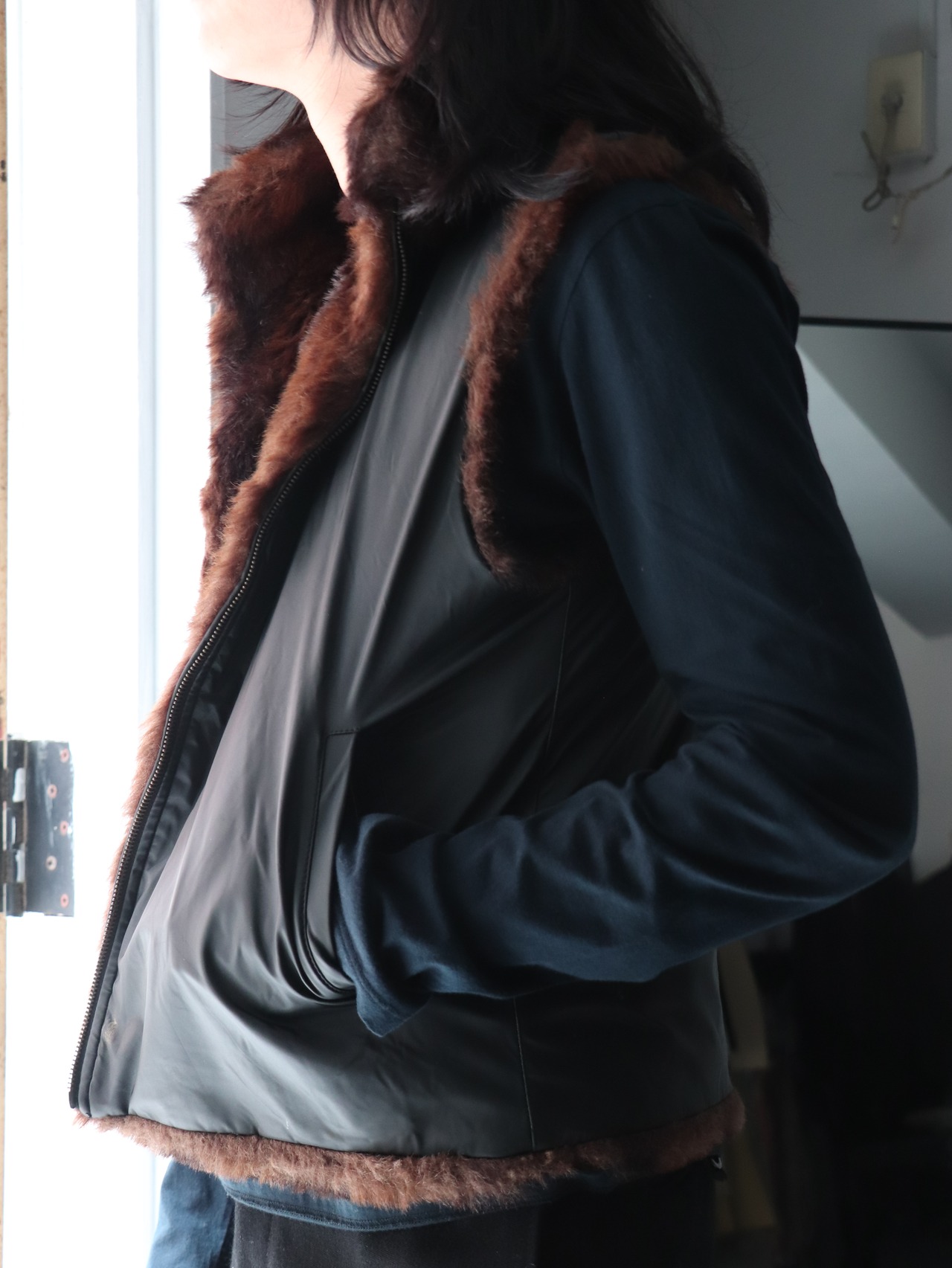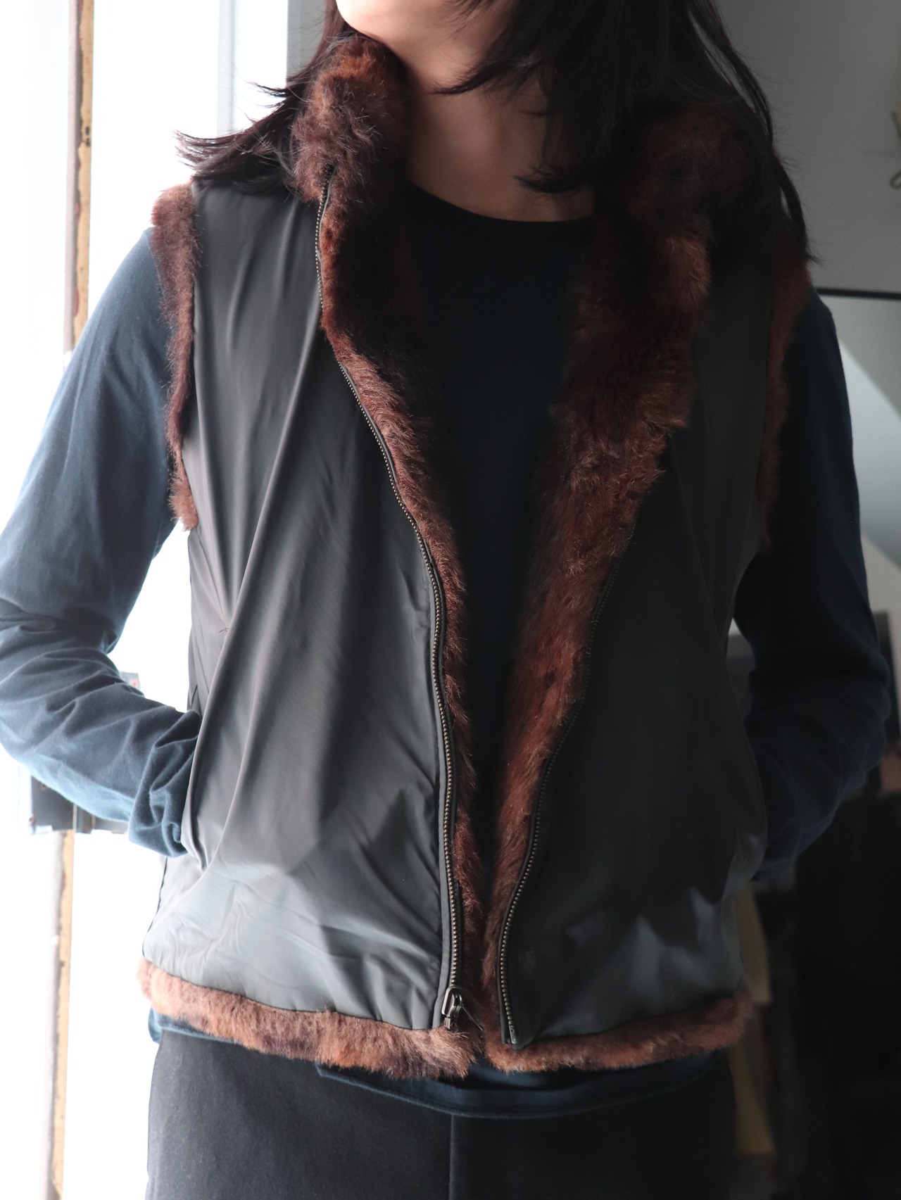 フェイクファーとPVCポリのリバーシブルベスト。