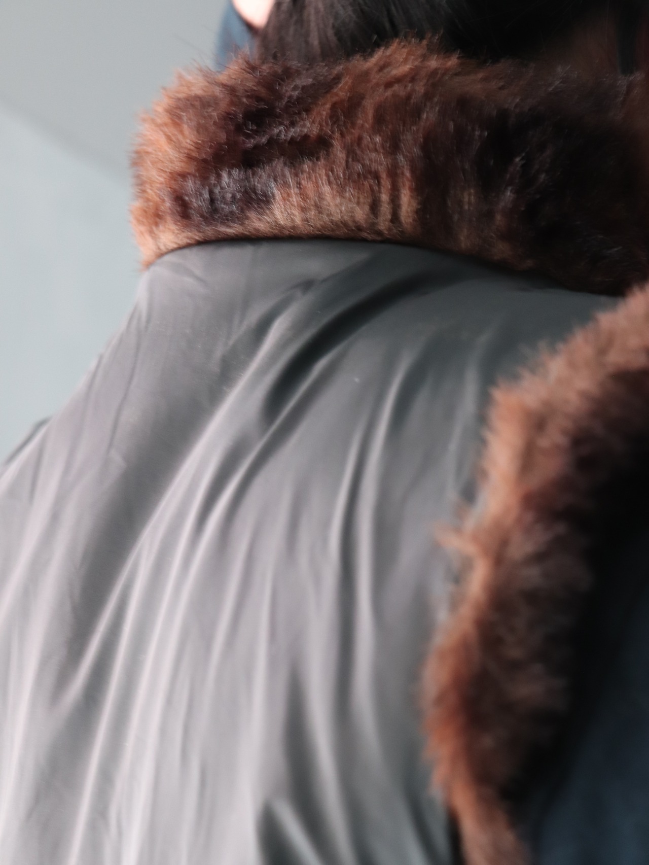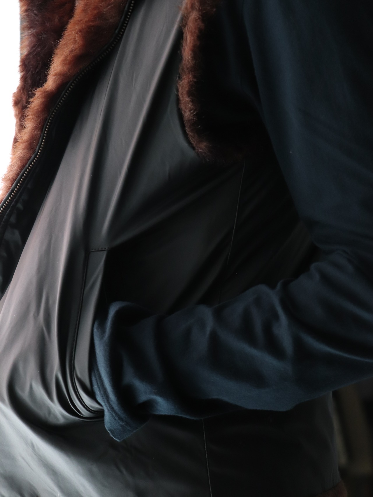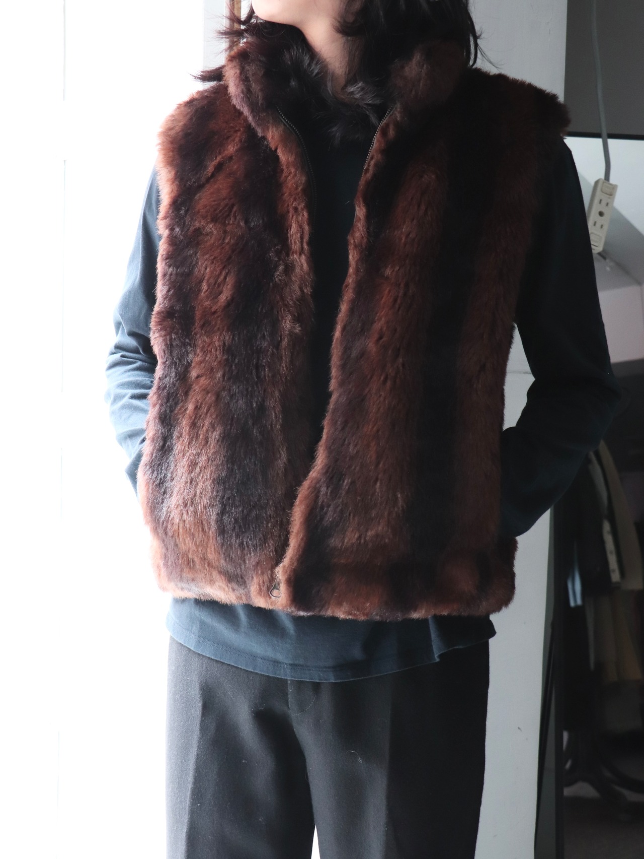 フェイクファーとPVCポリのリバーシブルベスト。