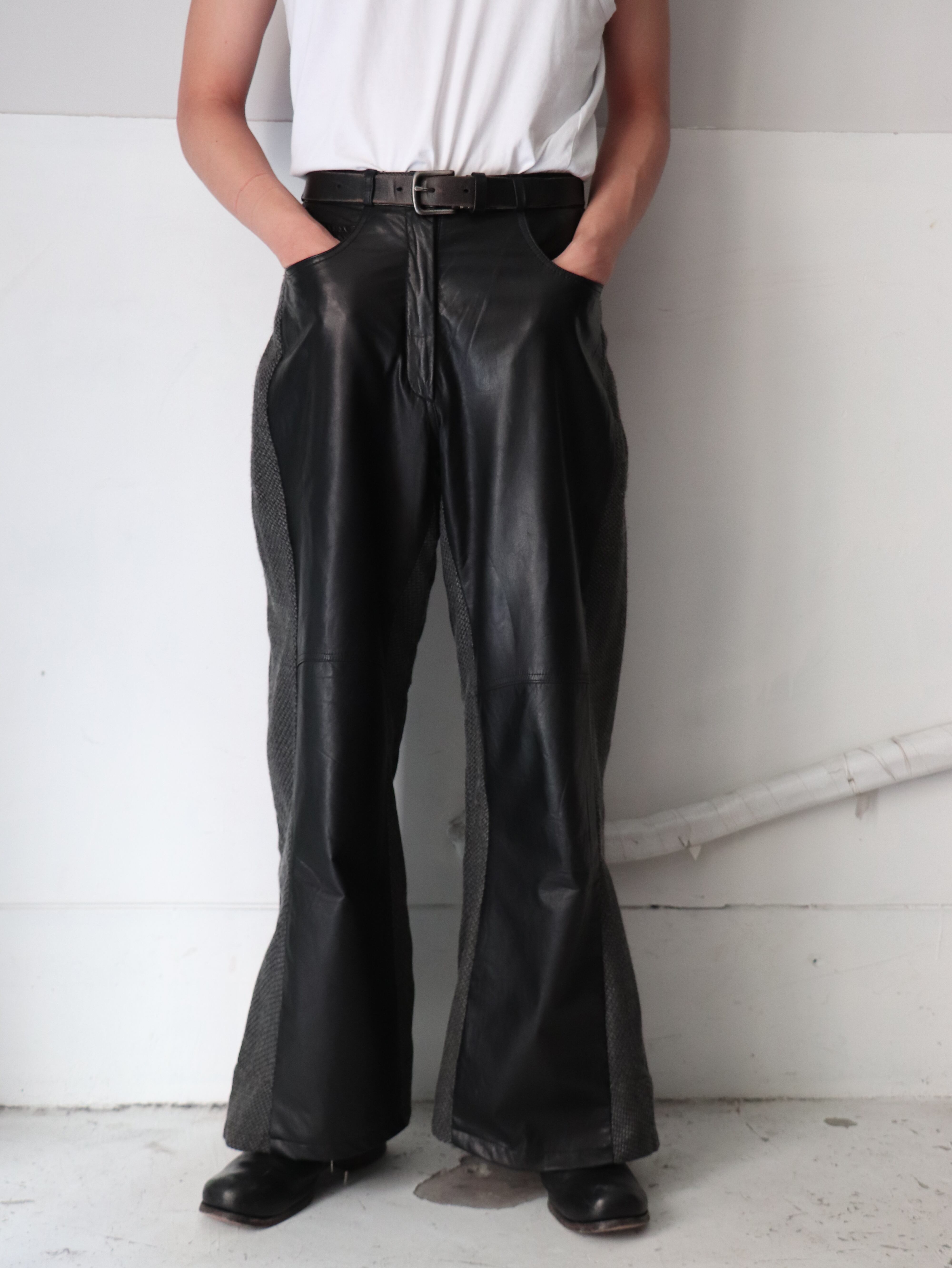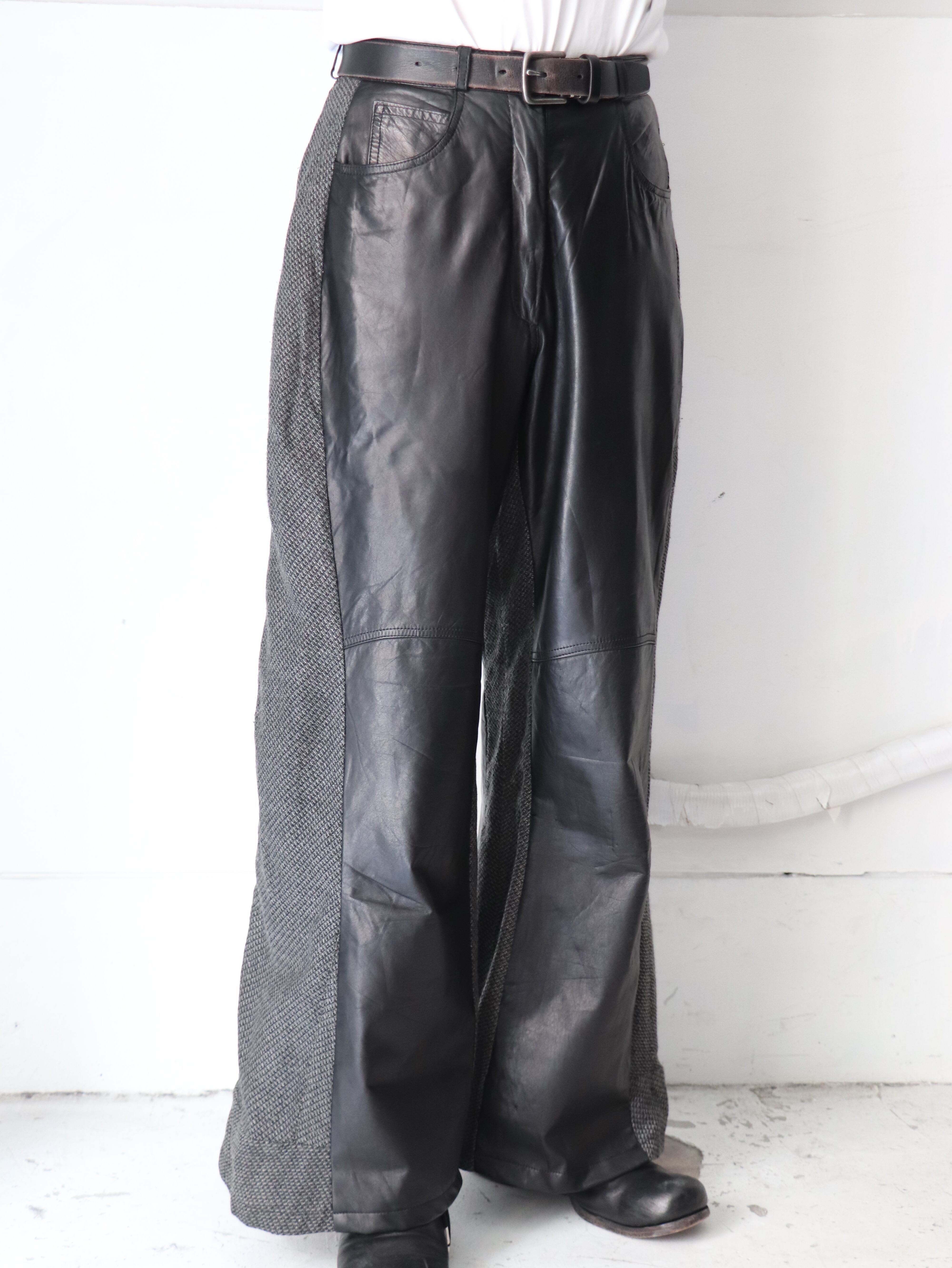 薄手の滑らかなレザーパンツとユーロのウールポリスラックスをドッキングしたカスタムバギーパンツ。