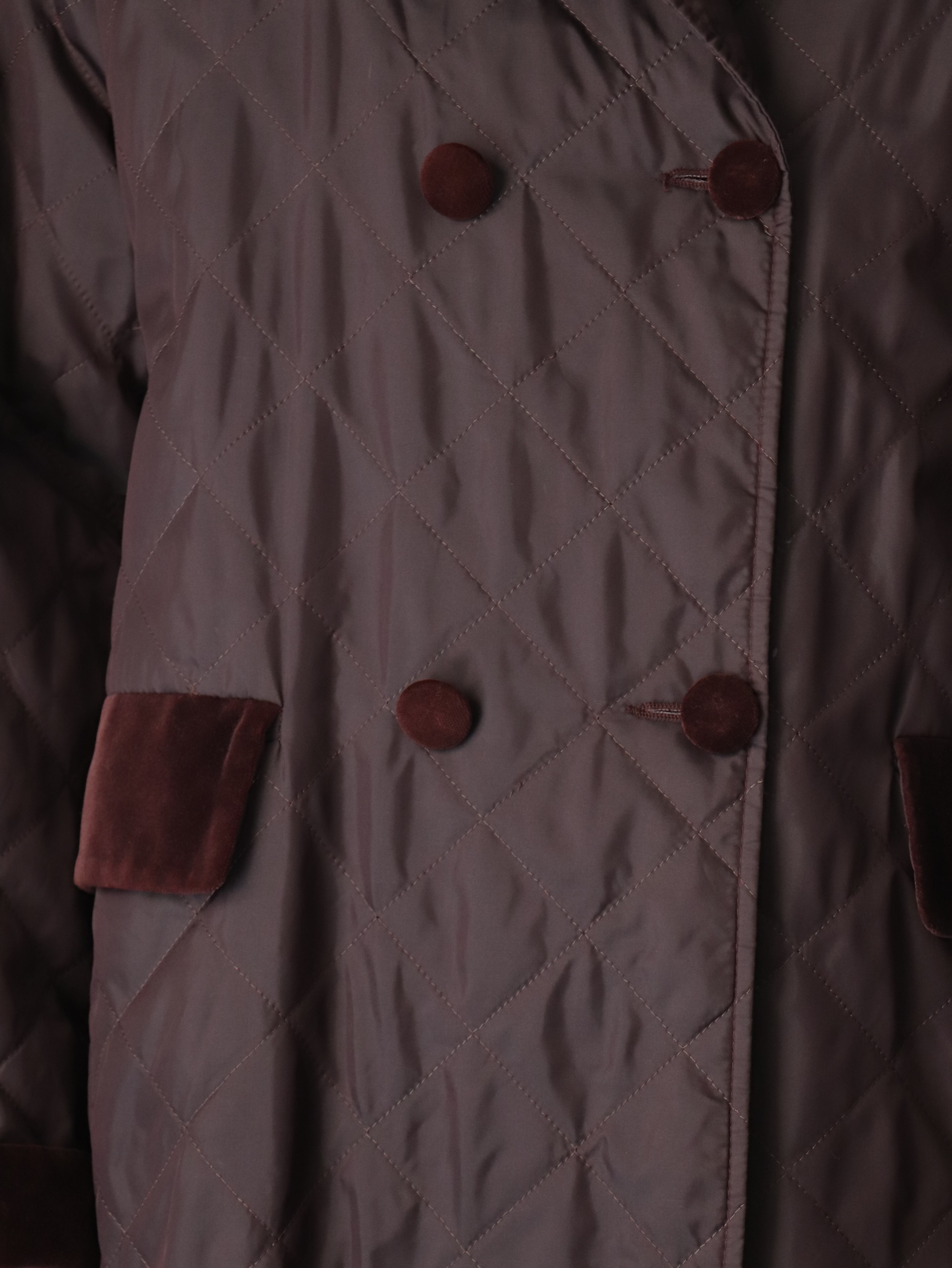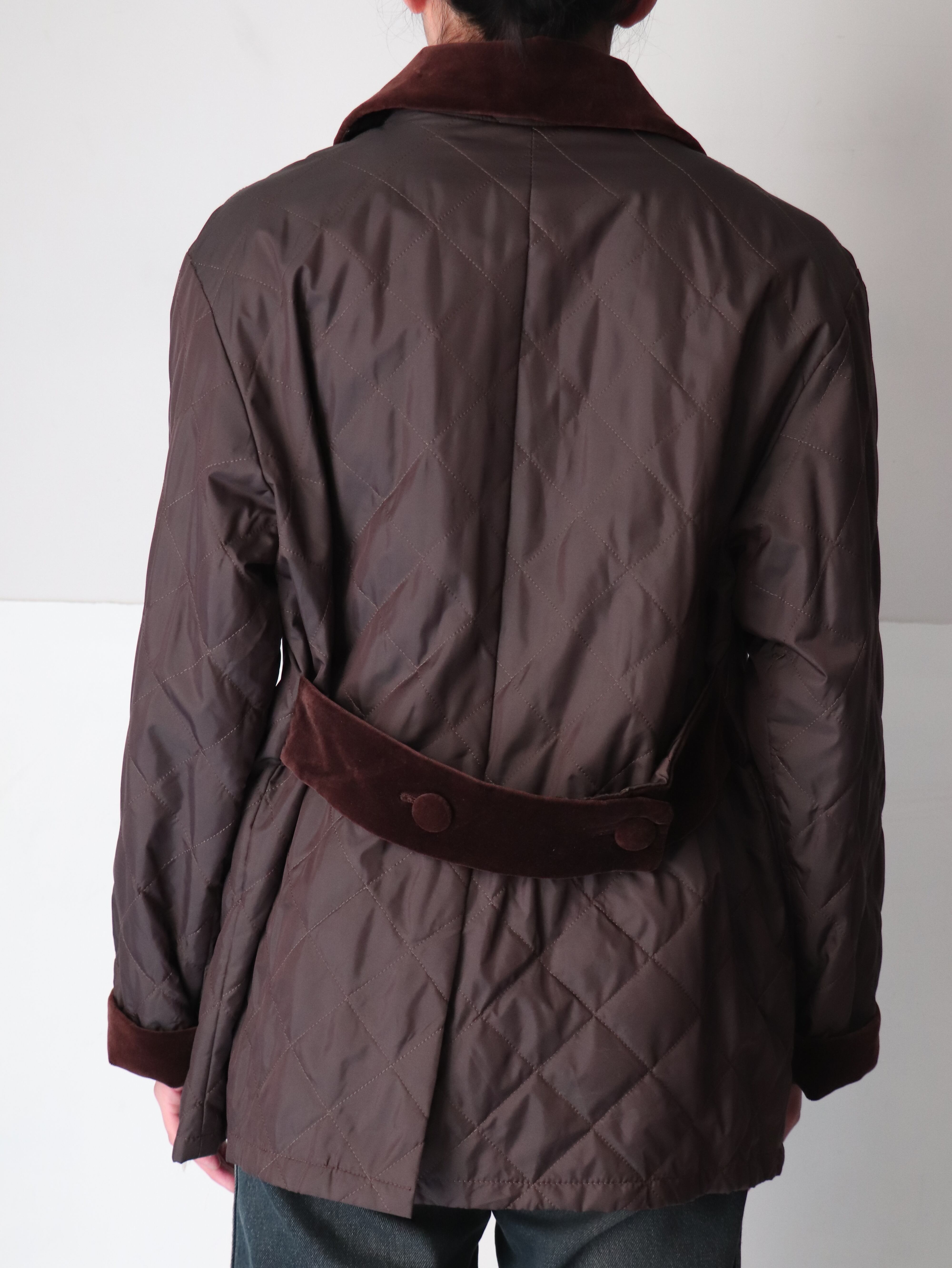 ナイロンとベロアの切替で仕立てられたキルティングジャケット。