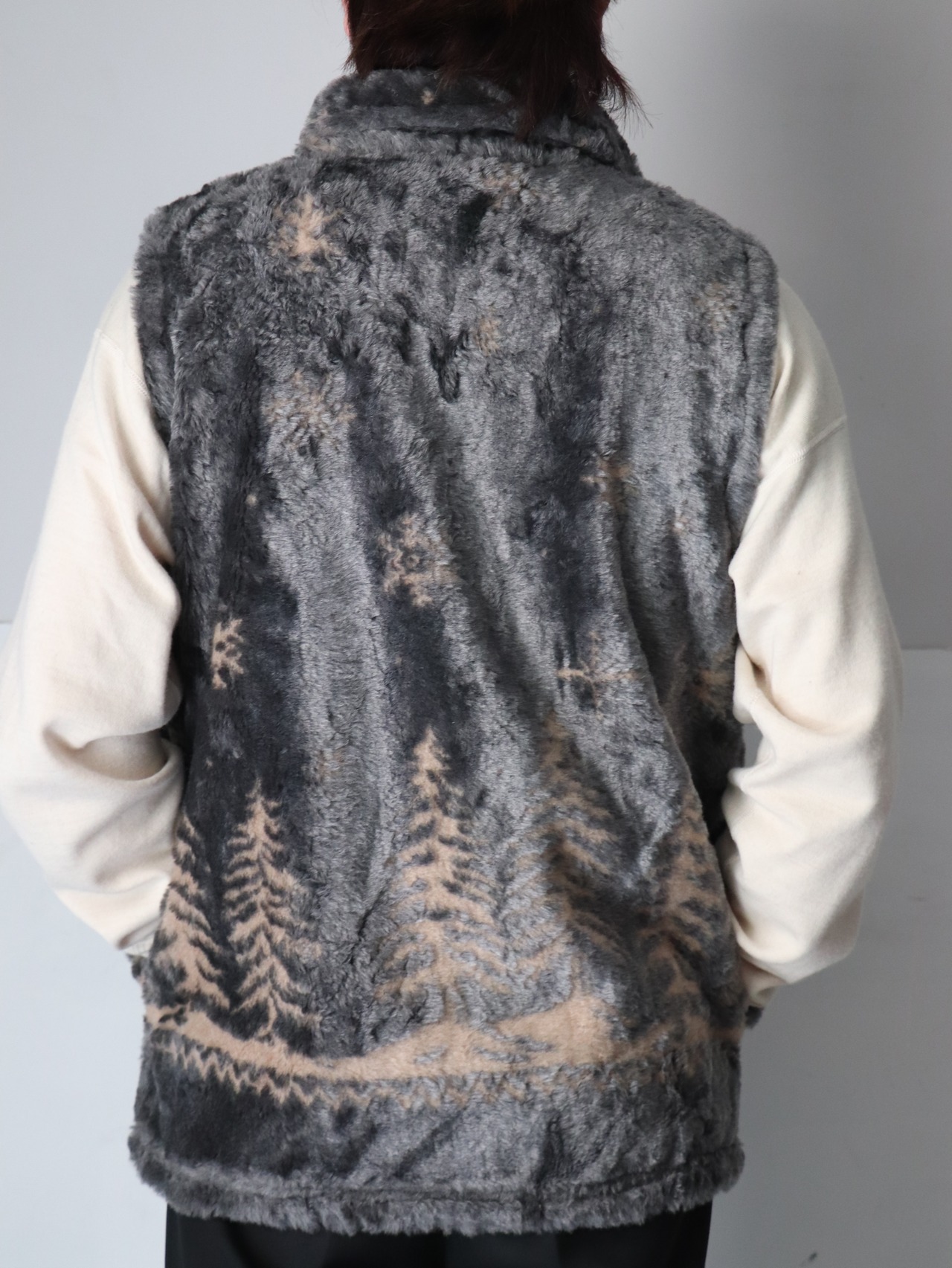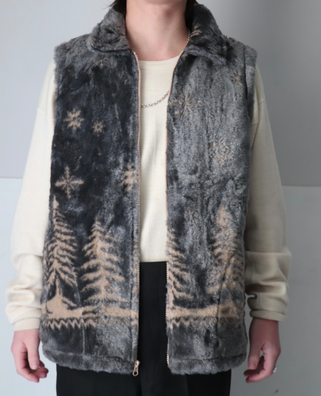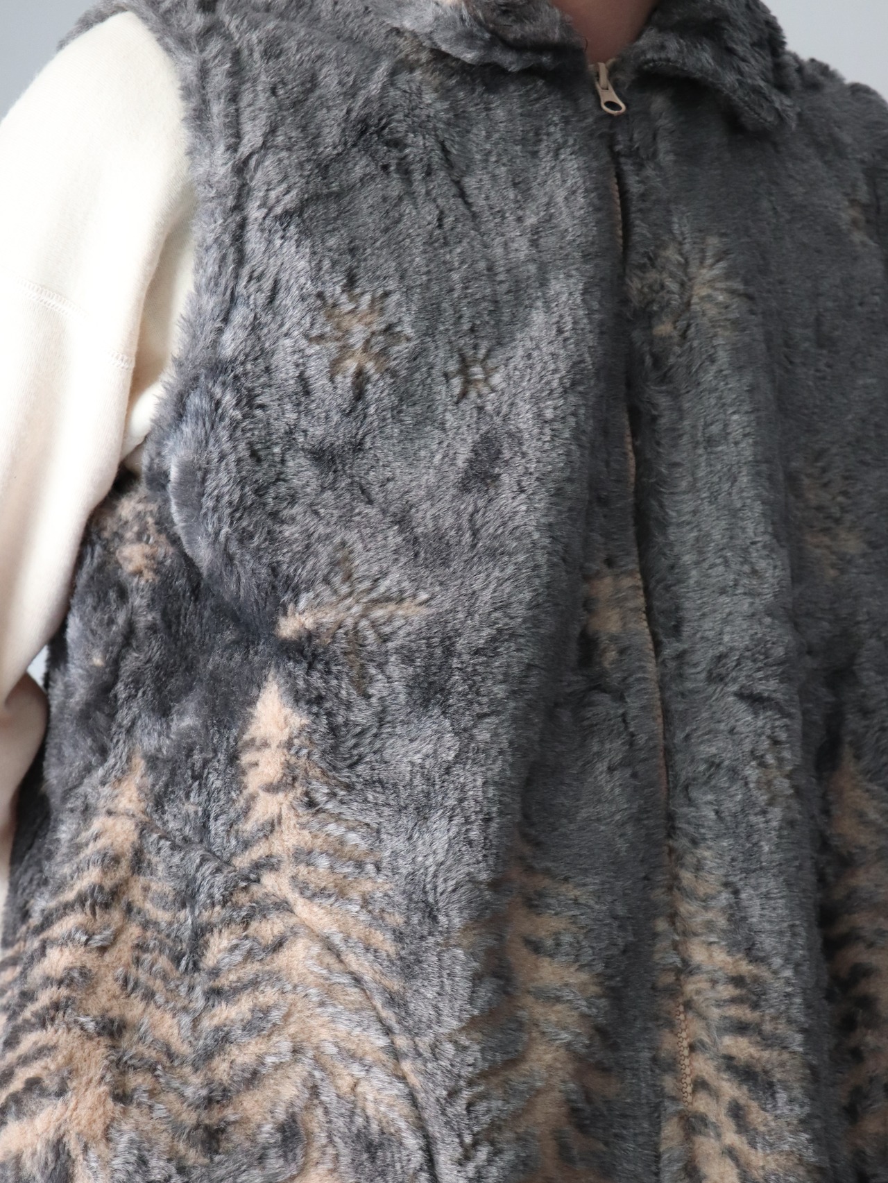 冬景色がパンチングされたフェイクファーベスト。