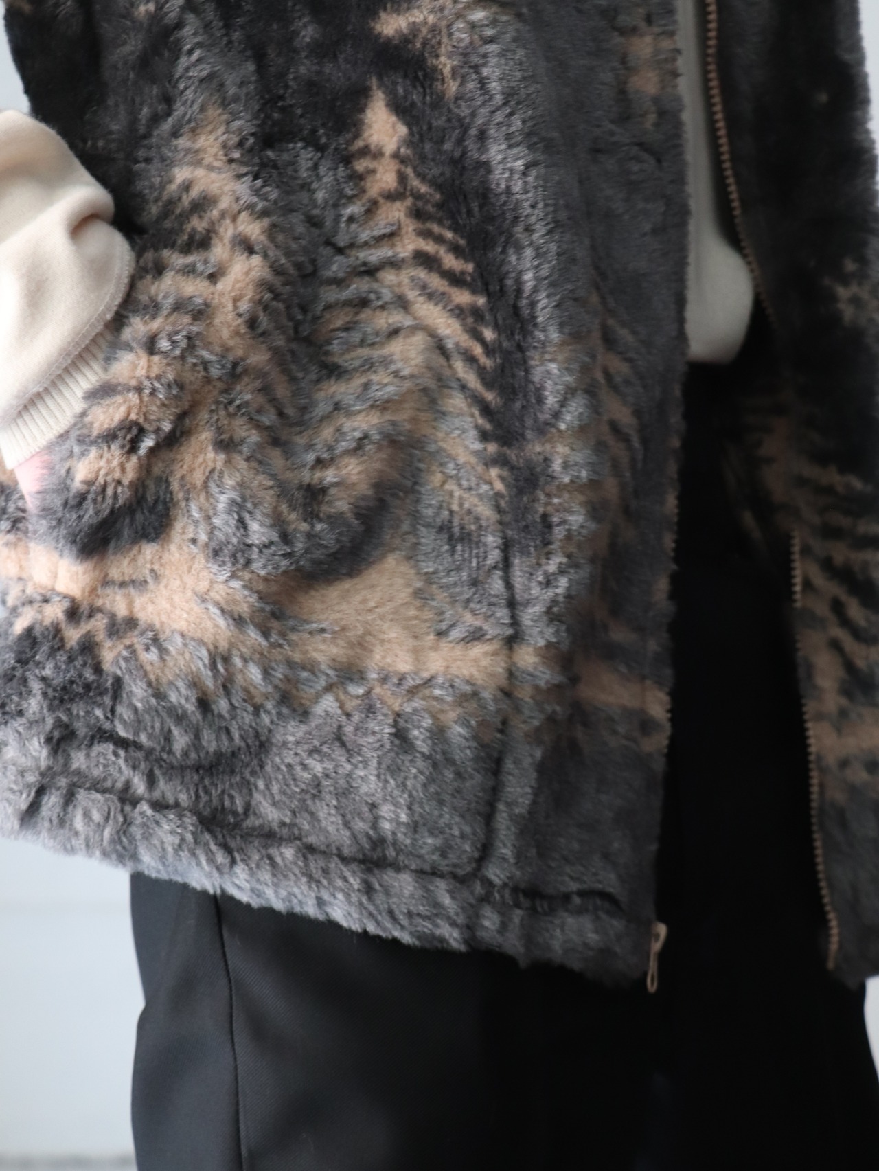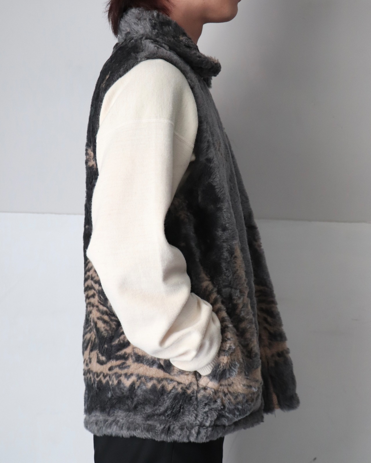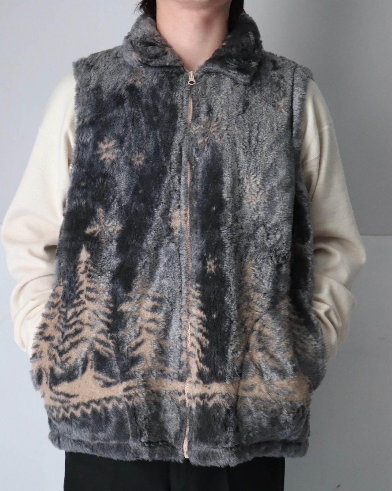冬景色がパンチングされたフェイクファーベスト。
